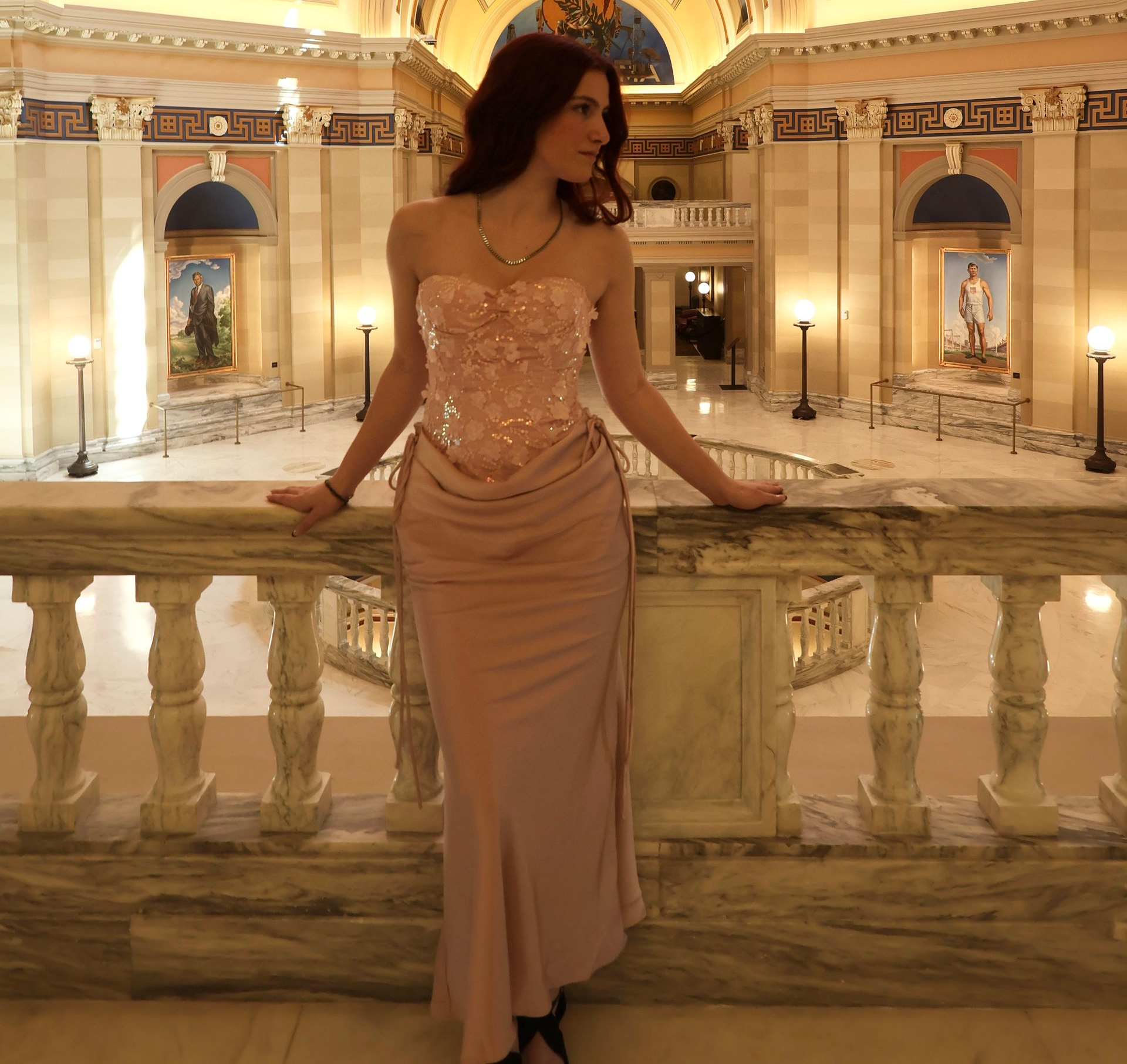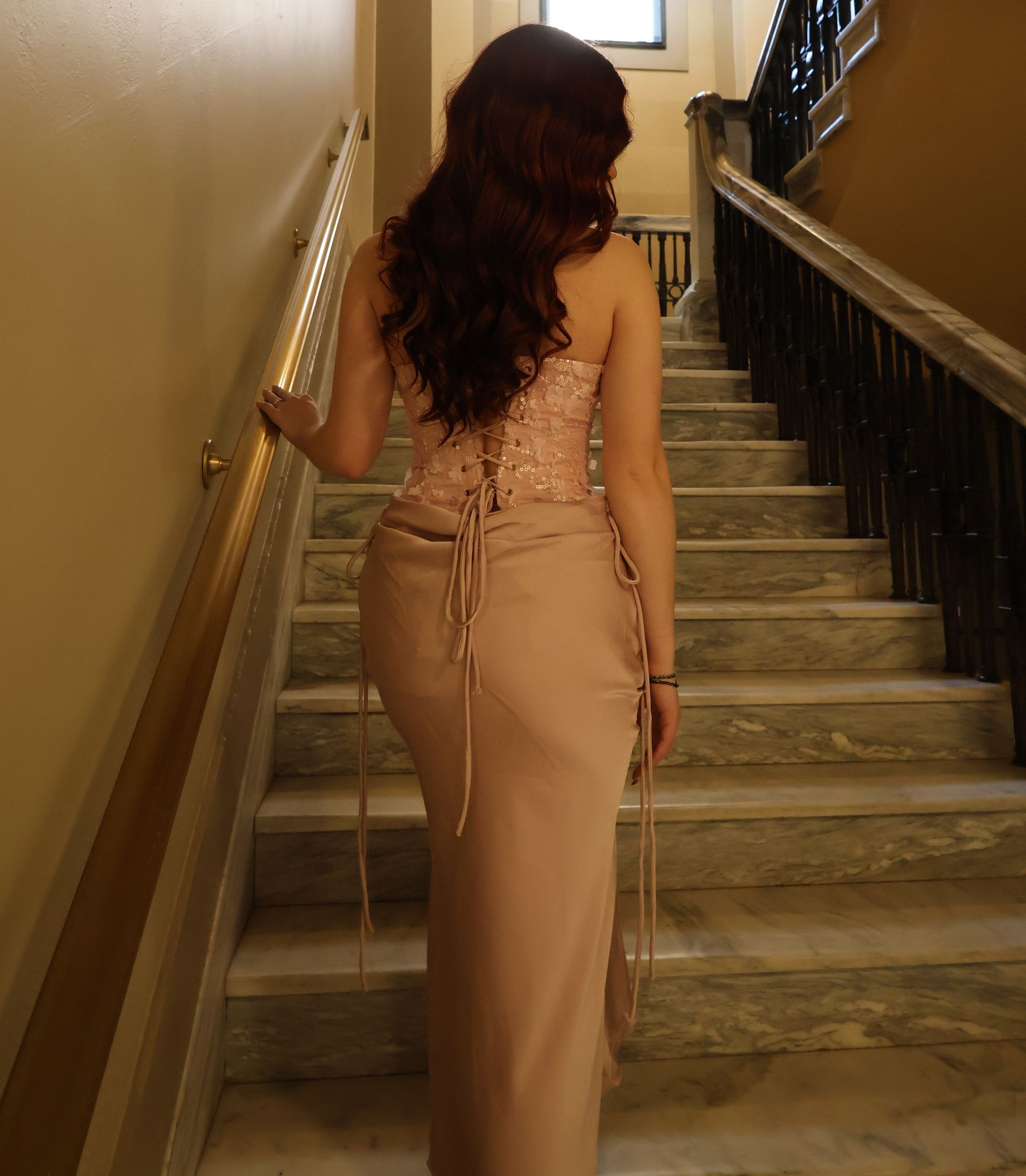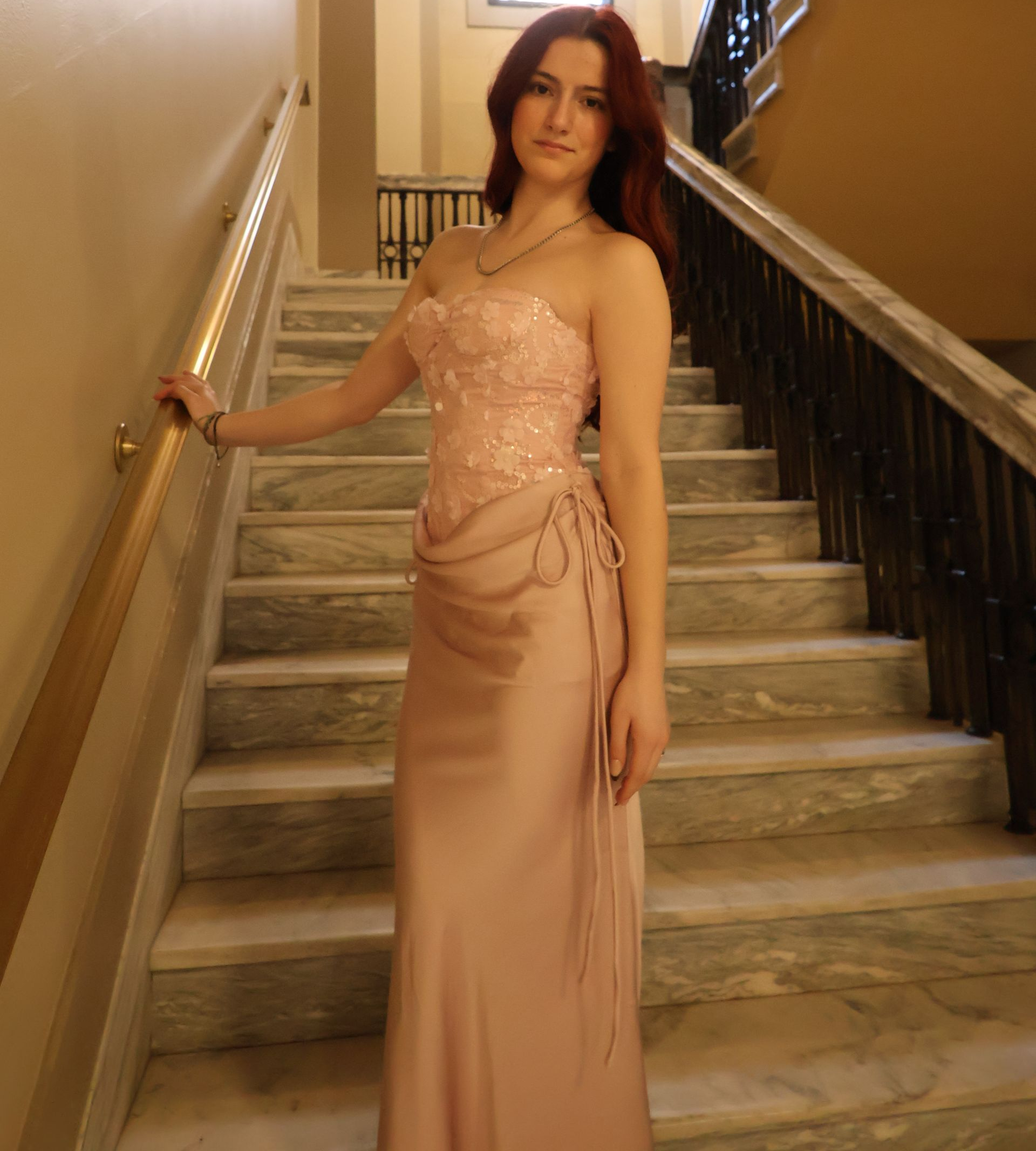 A romantic blush pink maxi dress designed to flatter petite frames. Featuring a structured corset bodice with delicate floral detailing, a lace-up back for an adjustable fit, and a softly draped skirt that flows effortlessly with movement. Elegant, feminine, and timeless—perfect for special occasions, evenings, or statement moments.